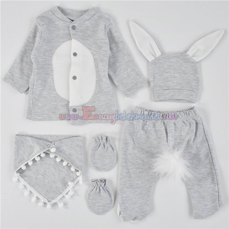 0-3 Ay 5 Parça Zıbın Takım Ponponlu Tavşan Gri