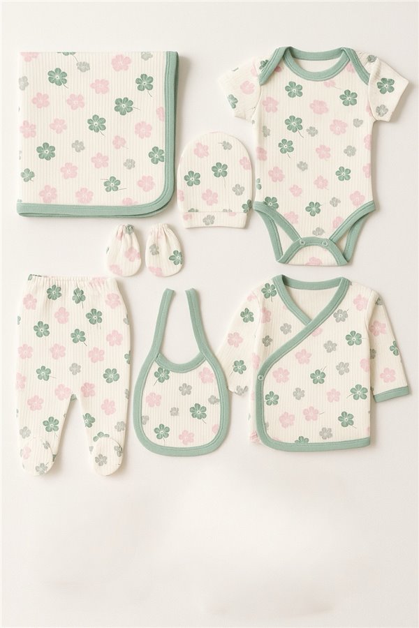 0-3 Ay 7 Parça Çiçek Desenli Bebek Zıbın Takım Yeşil