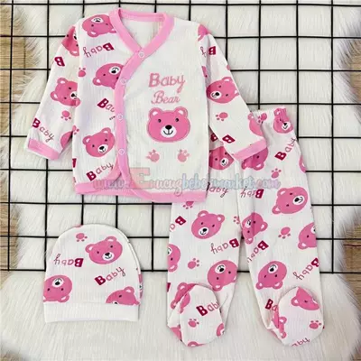 Özlv 0-3 Ay Bear Baskılı 3 Parçalı Bebek Takım Pembe