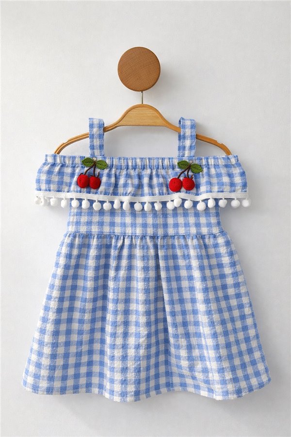 1-4 Yaş Kareli Kiraz Detaylı Kız Elbise Açık Mavi