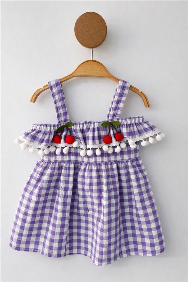 1-4 Yaş Kareli Kiraz Detaylı Kız Elbise Lila