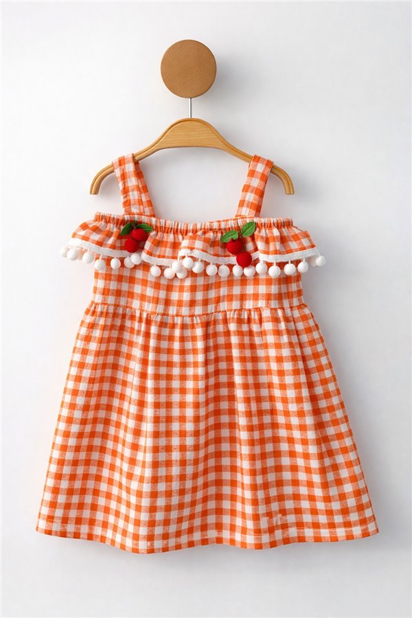1-4 Yaş Kareli Kiraz Detaylı Kız Elbise Turuncu