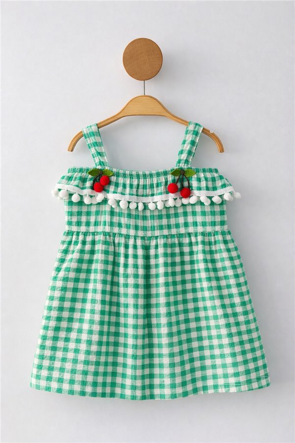 1-4 Yaş Kareli Kiraz Detaylı Kız Elbise Yeşil