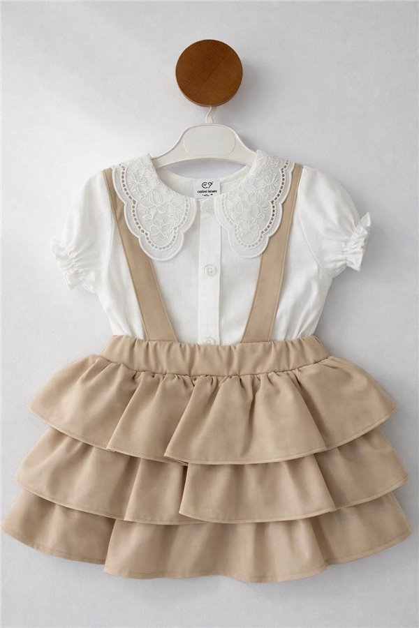 1-4 Yaş Kat Kat Fırfırlı Gömlekli Salopet Elbise Bej