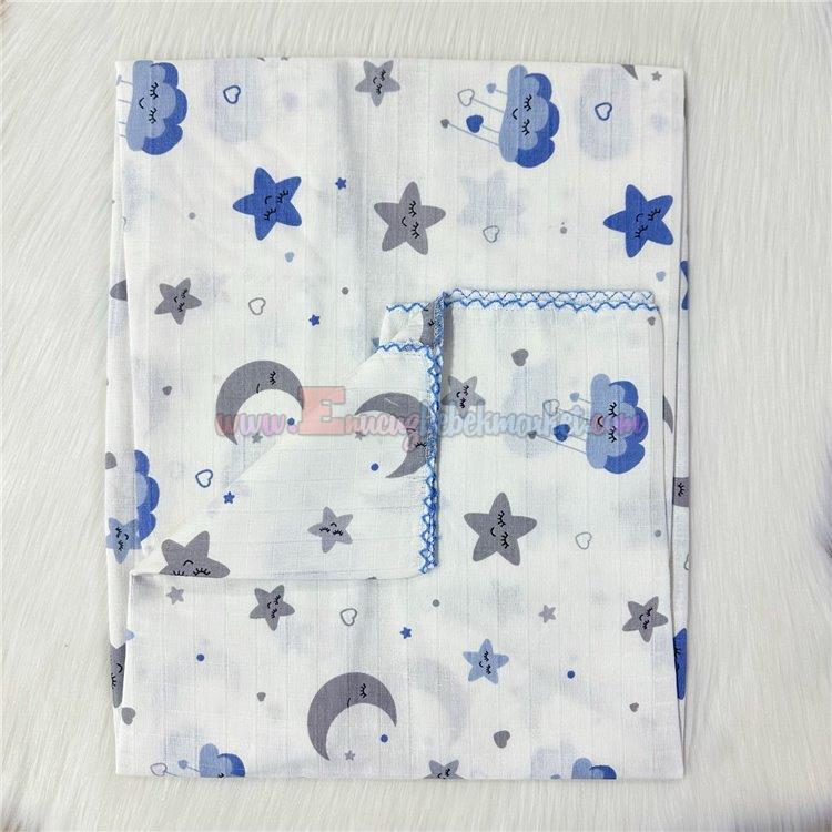 120X100 Cm Yıldız ve Bulut Desen Tek Kat Müslin Battaniye Mavi