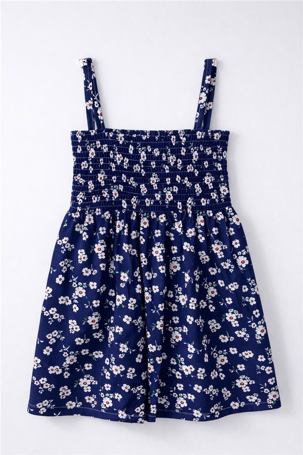 2-3-4-5 Yaş Gipeli İp Askılı Kız Çocuk Elbise Çiçekli Lacivert