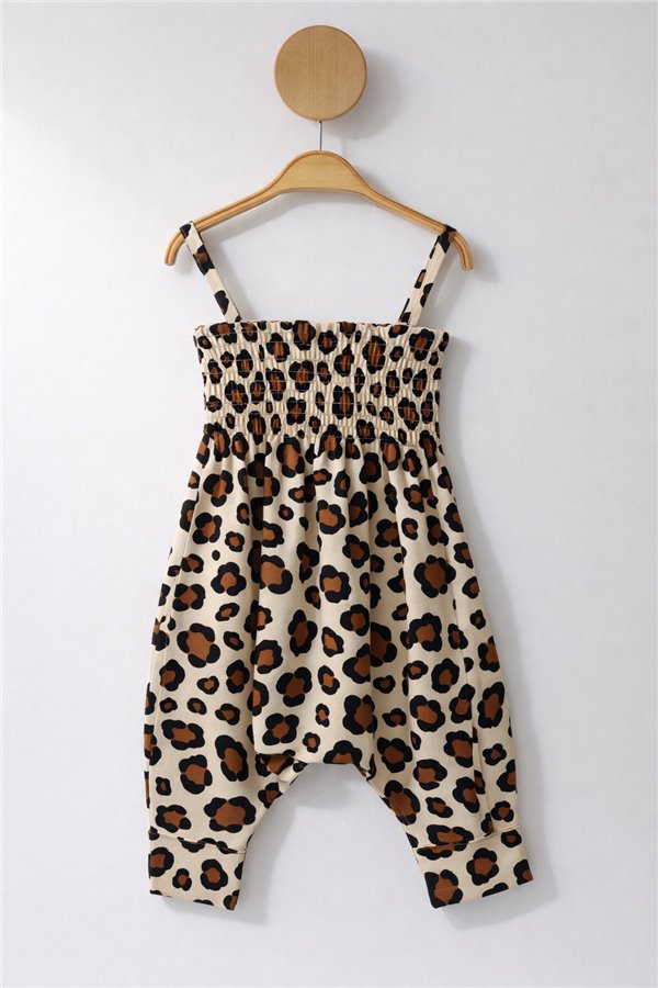 2-3-4-5 Yaş Gipeli İp Askılı Kız Çocuk Tulum Leoparlı Bej