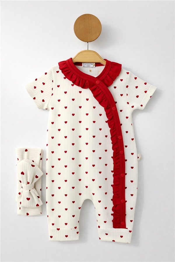 Mrt Baby 0-12 Ay Fırfırlı Kalpli Yazlık Tulum Kırmızı Beyaz