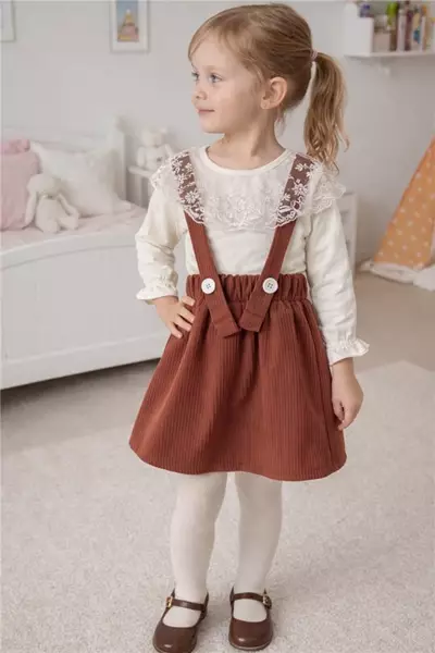 2-5 Yaş Kız Çocuk Badili Salopet Elbise Kahverengi