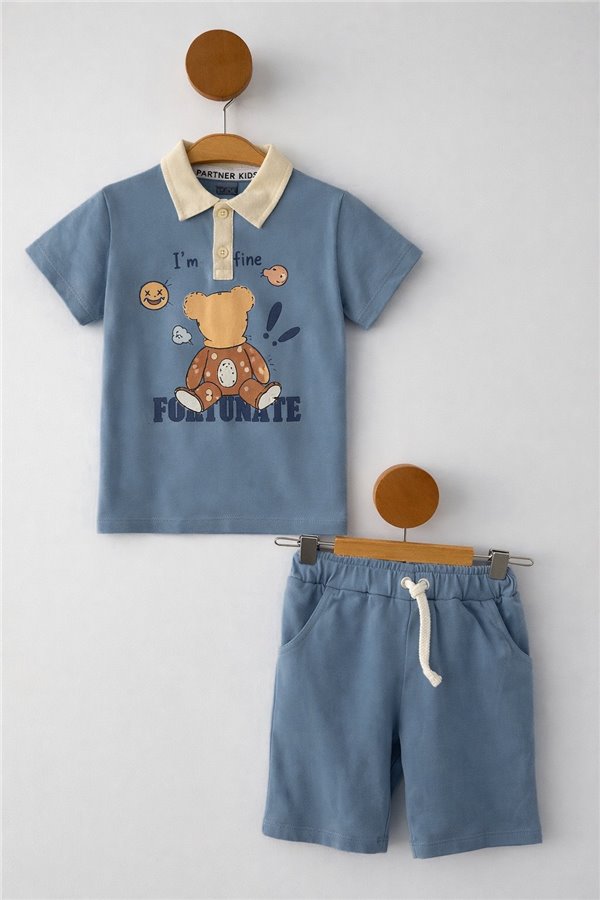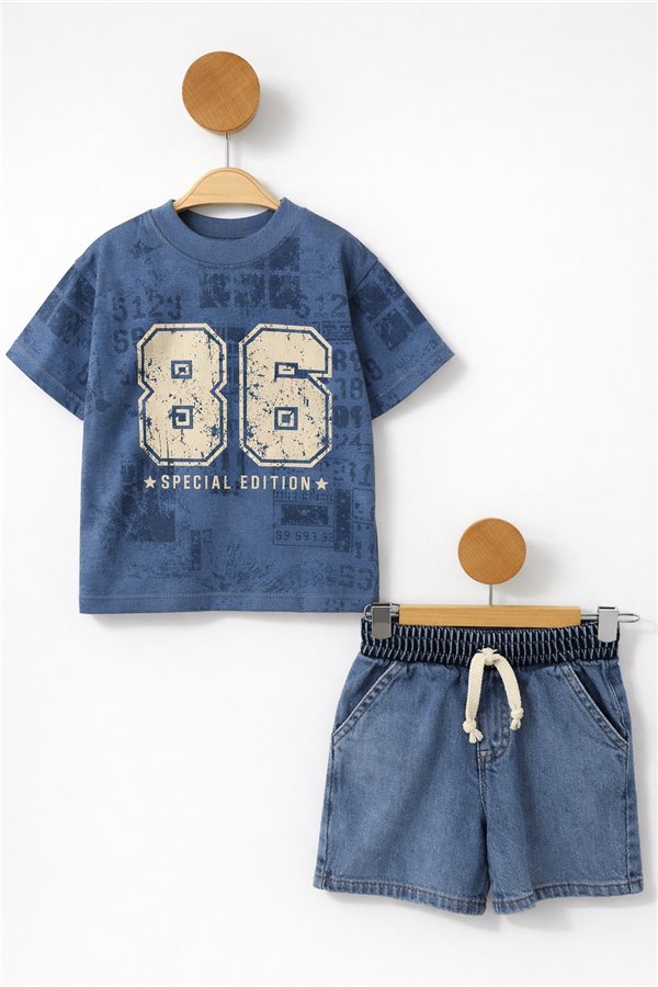 Mino 2-5 Yaş Kot Şortlu 86 Baskılı Erkek Çocuk Takım Koyu Mavi