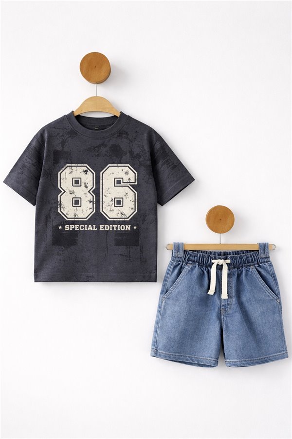 Mino 2-5 Yaş Kot Şortlu 86 Baskılı Erkek Çocuk Takım Antrasit