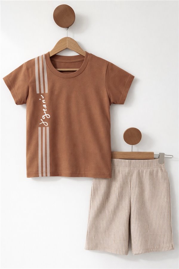 2-9 Yaş Yazlık Erkek Çocuk Takım Yazı Baskılı Kahverengi
