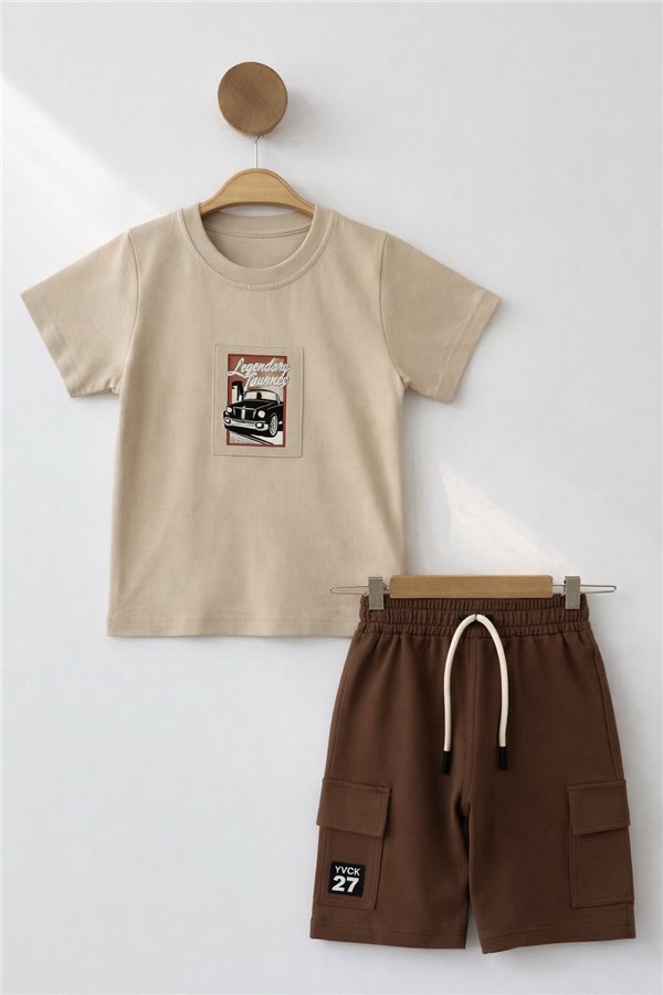 3-4-5-6 Yaş Araba Baskılı Erkek Çocuk Takım Bej