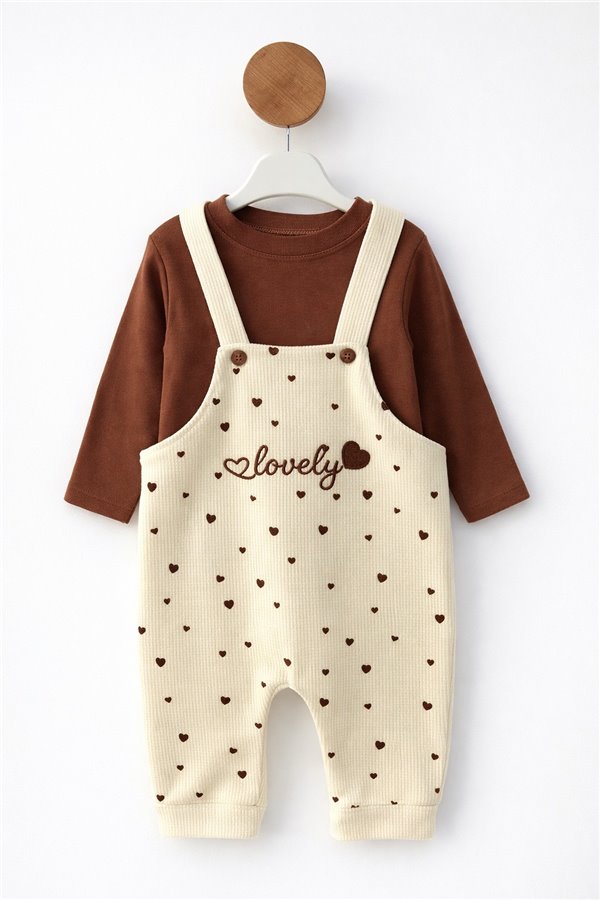 6-24 Ay Kalp Nakışlı Waffle Bahçıvan Tulum Kahverengi