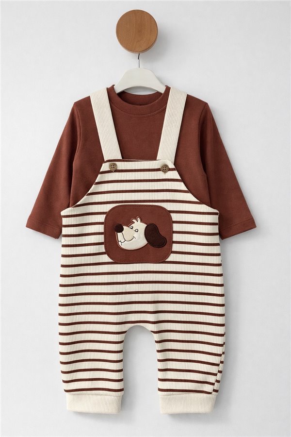 6-24 Ay Köpek Nakışlı Waffle Bahçıvan Tulum Kahverengi