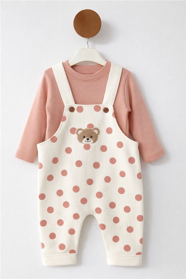 6-24 Ay Puanlı Ayı Nakışlı Waffle Bahçıvan Tulum Pudra