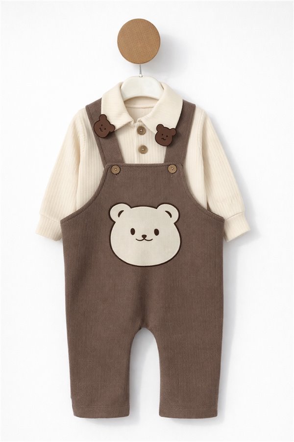 6-24 Ay Çizgili Ayıcık Nakışlı Waffle Bahçıvan Tulum Kahverengi