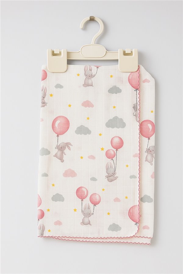 85X75 Cm Balonlu Tavşan Tek Kat Müslin Battaniye Pembe