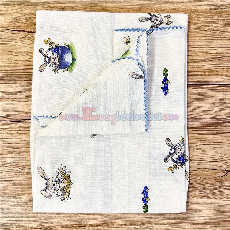 85X75 Cm Sepette Tavşan Desen Tek Kat Müslin Battaniye Mavi