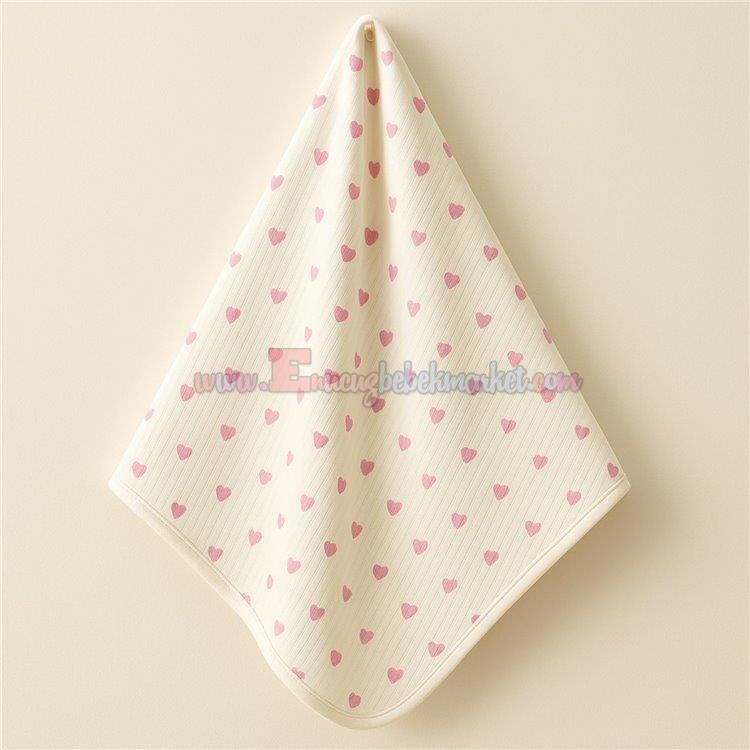 Pembe kalp desenleriyle şirin bir tasarıma sahip bu bebek battaniyesi, %100 pamuk penye kumaştan üretilmiştir. Bebeğinizin hassas cildi için nefes alabilen ve hafif bir yapı sunar.