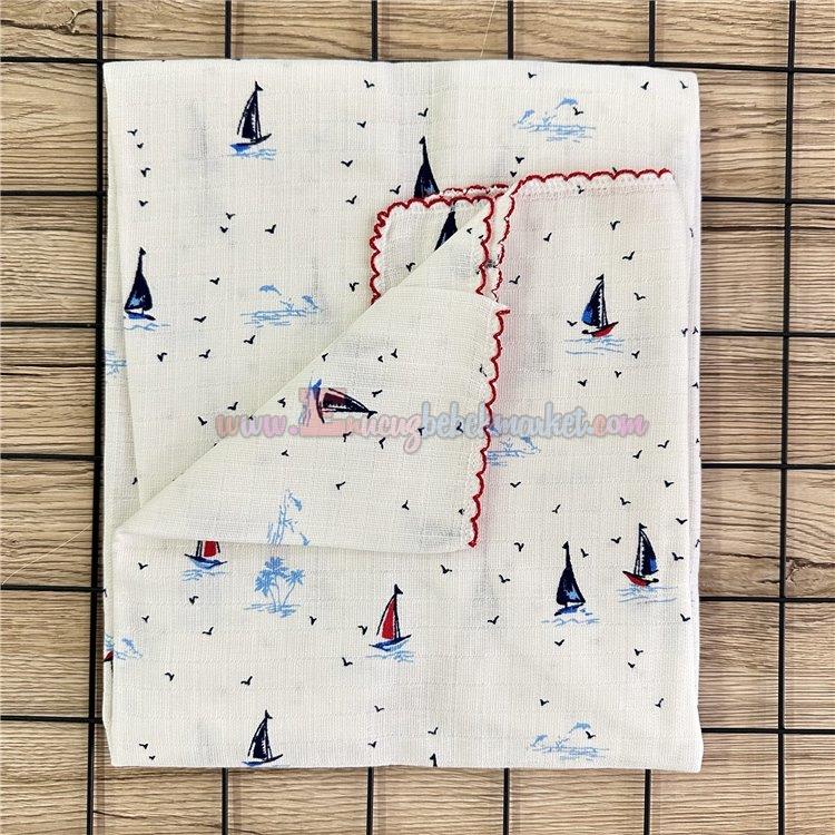 85X75 Cm Yelken Desen Tek Kat Müslin Battaniye Kırmızı Mavi