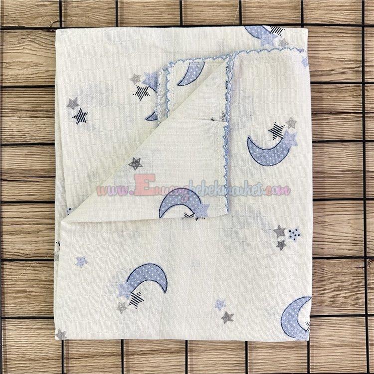 85X75 Cm Yıldız ve Ay Desen Tek Kat Müslin Battaniye Mavi