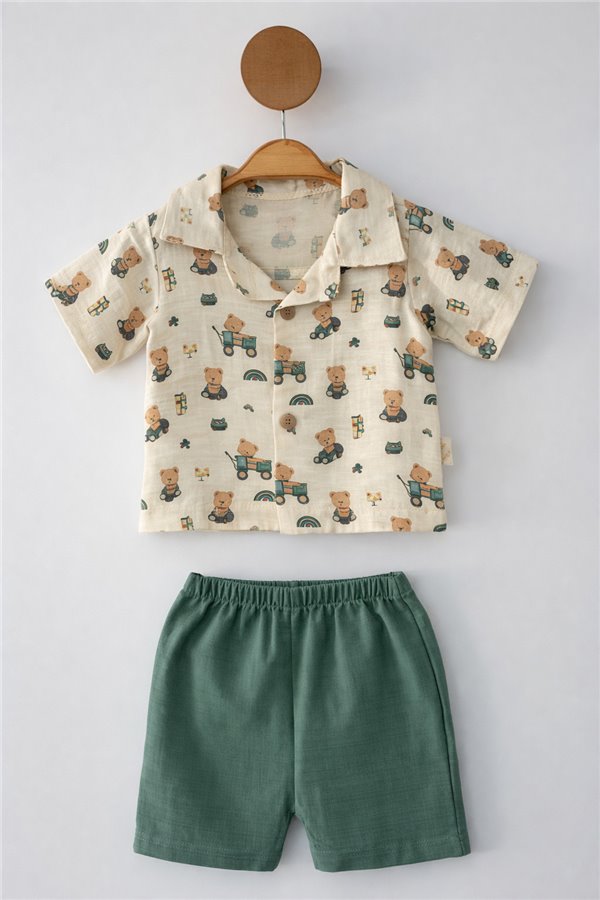9-12-18 Ay Müslin Erkek Bebek Takım Ayıcık Desenli Yeşil