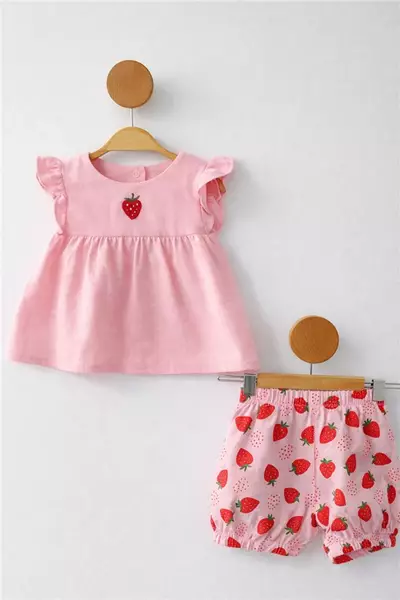 9-12-18 Ay Müslin Kız Bebek Takım Çilekli Pembe