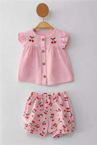 9-12-18 Ay Müslin Kız Bebek Takım Kirazlı Pembe