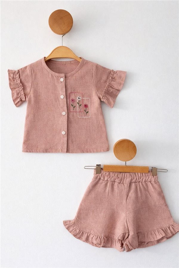 9-24 Ay Çiçek Nakışlı Yazlık Şortlu Kız Bebek Takım Gül Kurusu