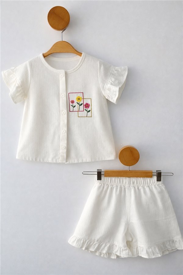 9-24 Ay Çiçek Nakışlı Yazlık Şortlu Kız Bebek Takım Krem