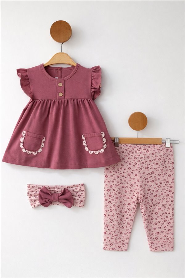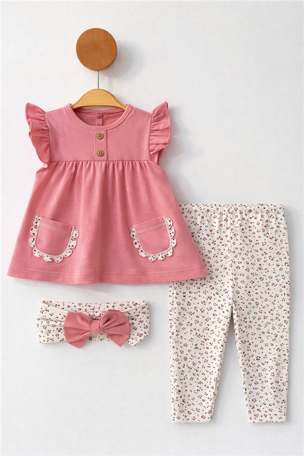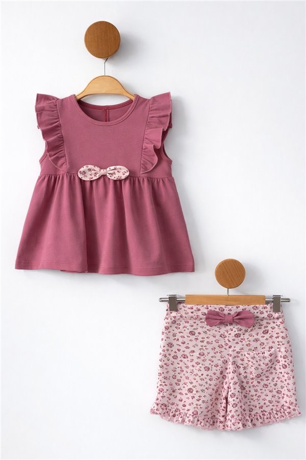 Deco 9-24 Ay Çiçekli Fiyonklu Bebek Takım Gül Kurusu