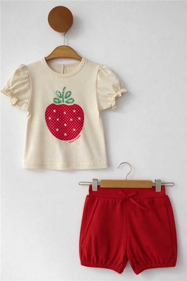 Deco 9-24 Ay Çilek Detaylı Yazlık Kız Bebek Takım Kırmızı