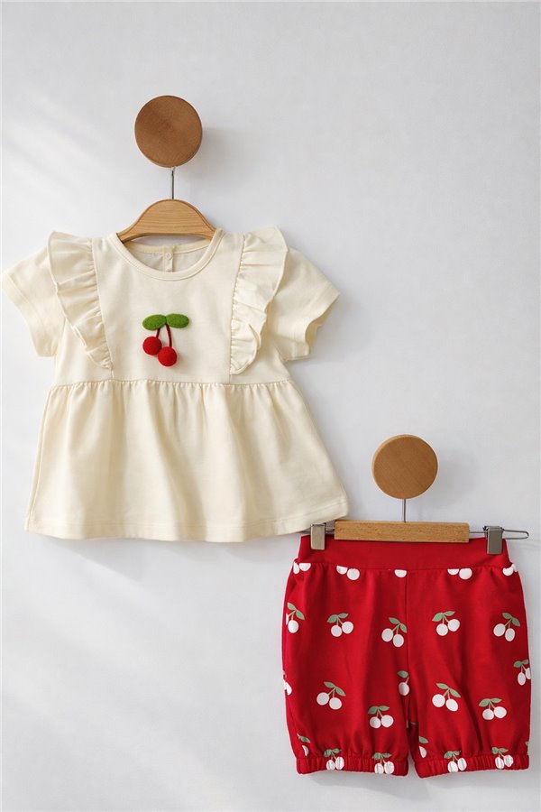 Deco 9-24 Ay Kiraz Detaylı Yazlık Kız Bebek Takım Kırmızı