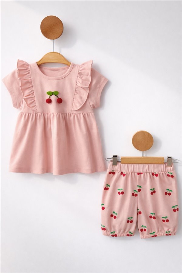 Deco 9-24 Ay Kiraz Detaylı Yazlık Kız Bebek Takım Pudra