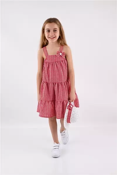 2-3-4-5 Yaş Gipeli İp Askılı Kız Çocuk Elbise Çilekli Model