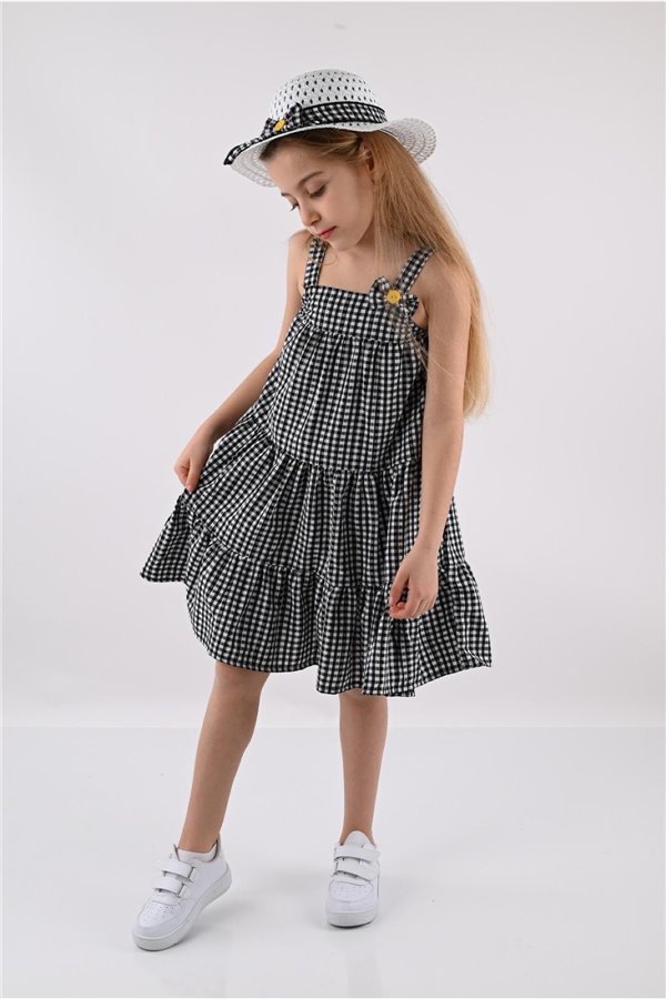 2-3-4-5 Yaş Gipeli İp Askılı Kız Çocuk Elbise Desenli Siyah