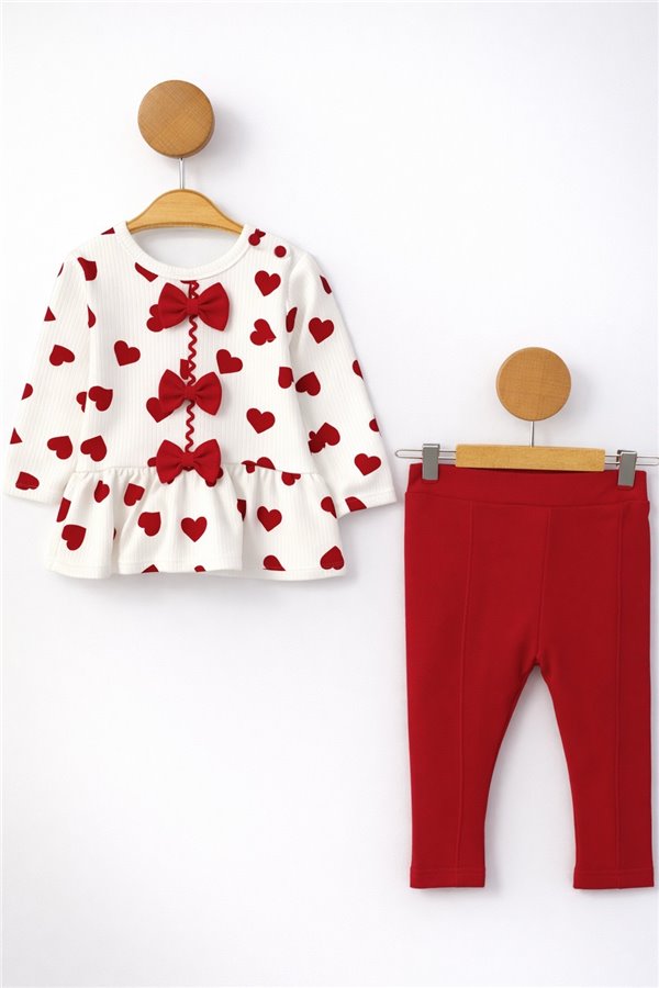 Nz Baby 9-24 Ay Penye Kız Bebek Takım Yaka Detaylı Kalpli Kırmızı