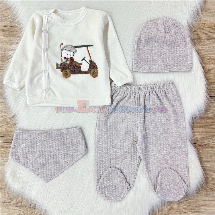 Babyim 0-3 Ay Arabalı 4'Lü Kadife Zıbın Takım Bej