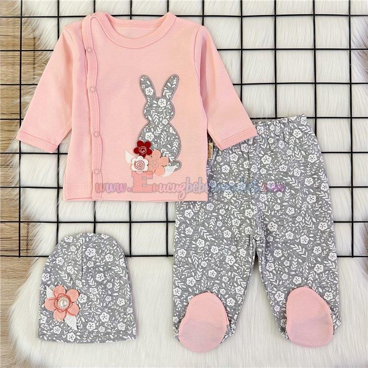 Babyim 0-3 Ay Tavşan Detaylı 3 Parça Zıbın Takım Somon