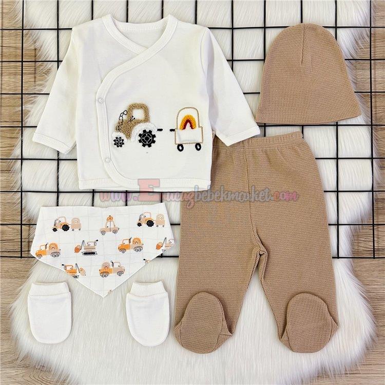 Babyim 0-3 Ay Traktör Detaylı 5 Parça Zıbın Takım Kahve