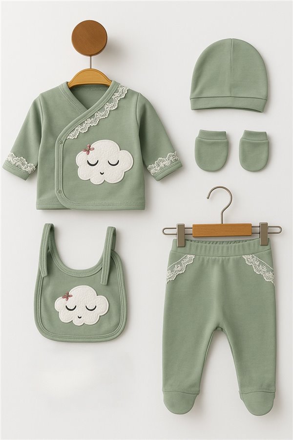 Beyaz Bebek 0-3 Ay 5 Parça Zıbın Takım Bulutlu Yeşil