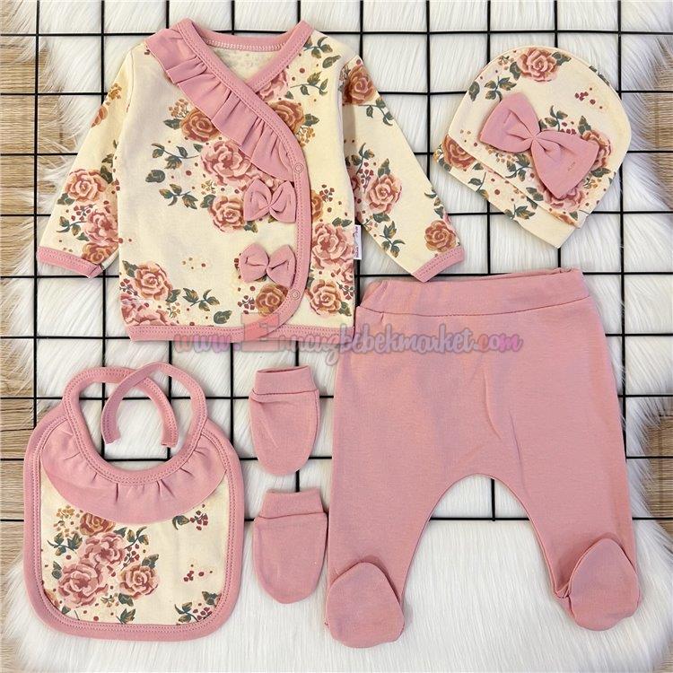 Beyaz Bebek 0-3 Ay Çiçekli 5 Parça Zıbın Takım Gül Kurusu