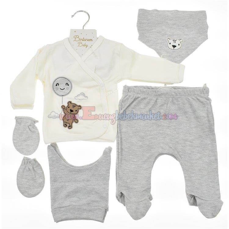 Birtanem 0-3 Ay 5 Parça Zıbın Takım Ayıcık Nakışlı Gri