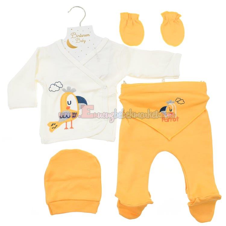 Birtanem 0-3 Ay 5 Parça Zıbın Takım Papağan Nakışlı Koyu Sarı