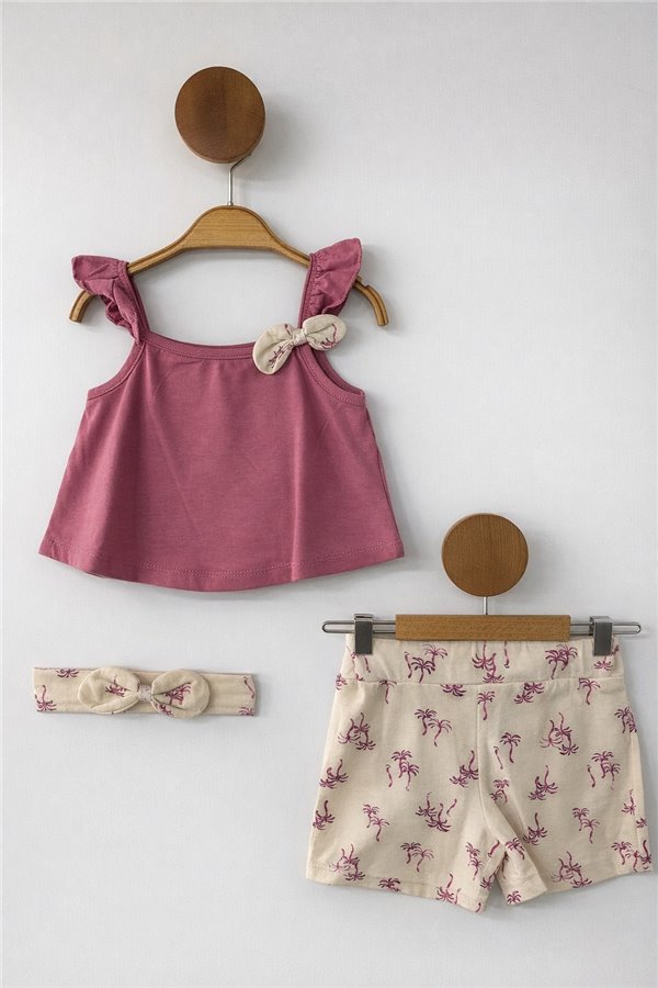 Deco 9-24 Ay Palmiye Baskılı Fiyonklu Kız Bebek Takım Gül Kurusu