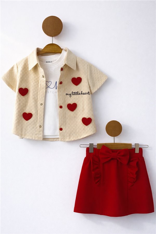 Bomlo 6-24 Ay Kalp Nakışlı Şort Etekli Kız Bebek Takım Kırmızı