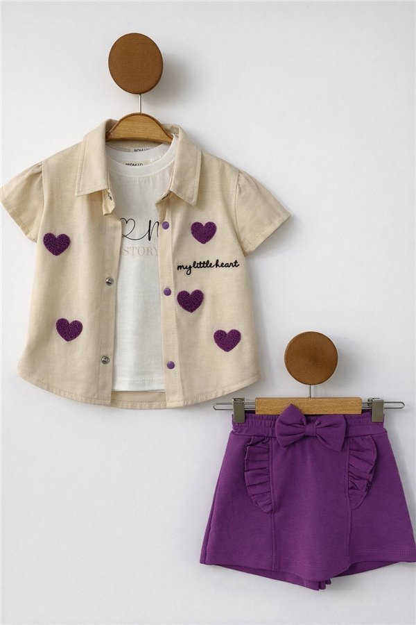 Bomlo 6-24 Ay Kalp Nakışlı Şort Etekli Kız Bebek Takım Mor