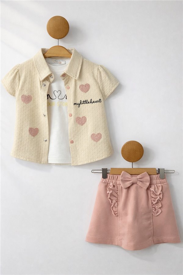 Bomlo 6-24 Ay Kalp Nakışlı Şort Etekli Kız Bebek Takım Pudra