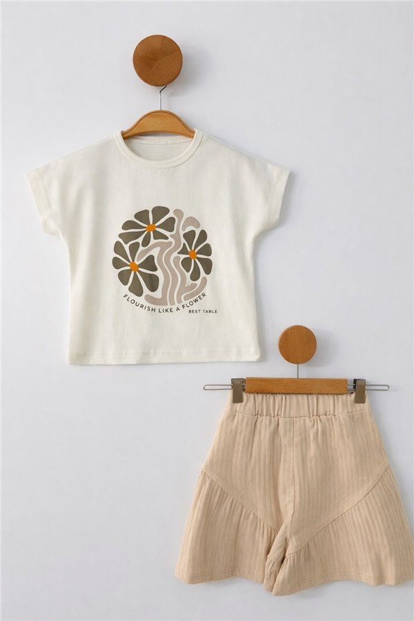 2-9 Yaş Yazlık Kız Çocuk Takım Fiyonk Baskılı Bej